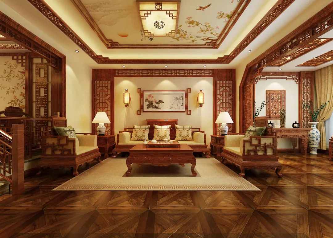 中式風(fēng)格就是把我們幾千年的文化歷史融入到我們的室內(nèi)設(shè)計(jì)當(dāng)中。紅棕色的木紋把我們的思想帶到了明清年代或者更久之前,它給我們莊重而優(yōu)雅的感受。當(dāng)紅棕色的木線當(dāng)中加載著花鳥古畫那種悠然自得,鳥語(yǔ)花香的自然場(chǎng)景映入眼簾。鏤空木線布滿整個(gè)屋子空間,鏤空的木紋雕花拱口造型、樓梯的木質(zhì)花樣再加上家具的各種雕花、最后加上青花瓷材質(zhì)的花瓶配飾、花盆與臺(tái)燈,此時(shí)此刻中式風(fēng)格的細(xì)膩、壯麗華貴就展現(xiàn)在我們眼前。