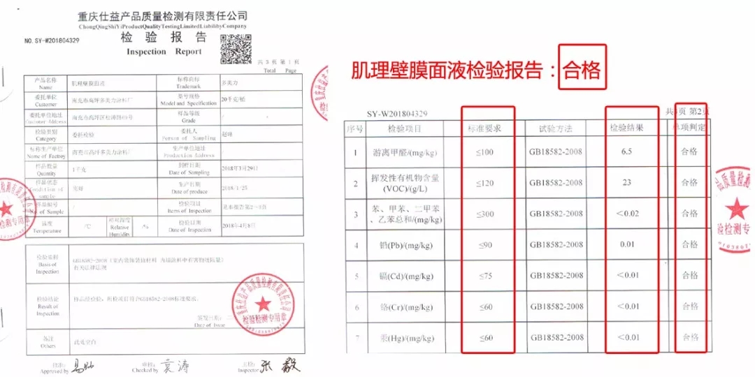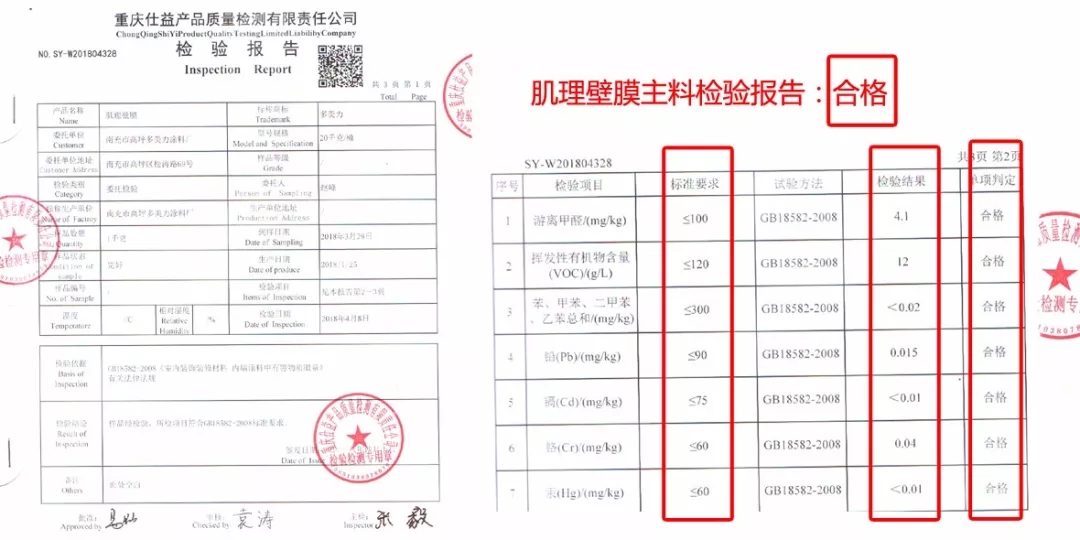 環(huán)保性能——多美力肌理壁膜的原材料為水基性聚合樹脂、顏填料、助劑等組合而成,無任何有害物質(zhì),產(chǎn)品也通過了權(quán)威機(jī)構(gòu)檢測,其檢測標(biāo)準(zhǔn)為:國家《室內(nèi)裝飾裝修材料 內(nèi)墻涂料中有害物質(zhì)限量》(GB 18582-2008)標(biāo)準(zhǔn),檢測結(jié)果顯示:無任何有害物質(zhì)檢出!下面附有多美力肌理壁膜檢測合格報(bào)告書。