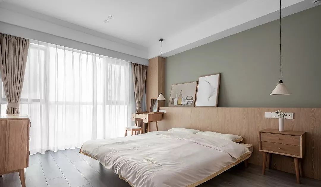 床頭墻面以淡藍(lán)色為主打,加上兩個(gè)床頭燈,一是省空間,二是營(yíng)造北歐氛圍。木質(zhì)床頭柜的紋理感,增添自然平和的氣息。